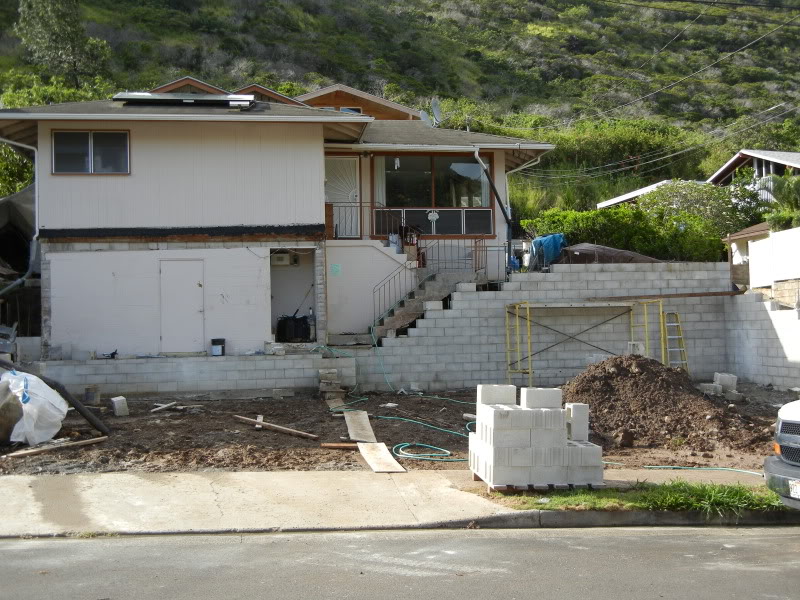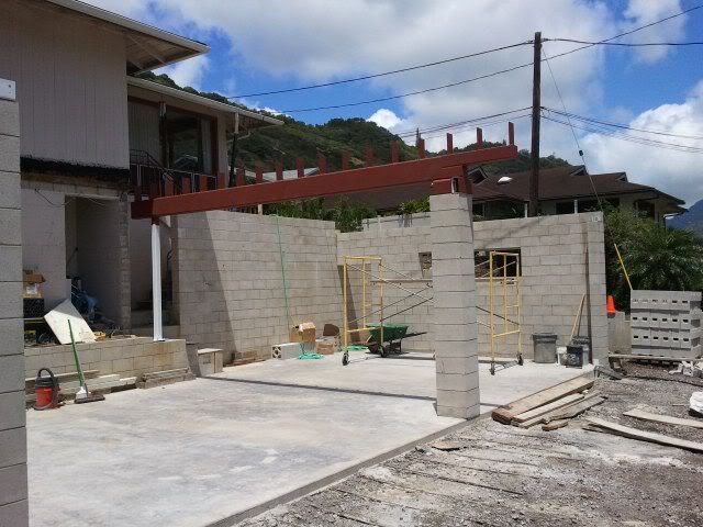 glu-lam beams, steel posts, and fully grouted reinforce CMU retention wall